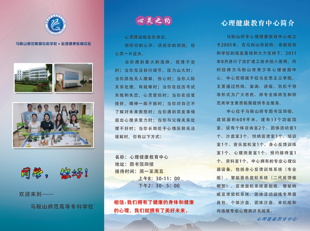 心向爱,身向光。陌生的环境,陌生的处境,难免会产生焦虑不安,心理健康教育中心愿意做你永远的守护者,为你排解困扰。中心全体工作人员将以最热情、尊重、平等、保密的原则提供最真诚的心灵健康服务。