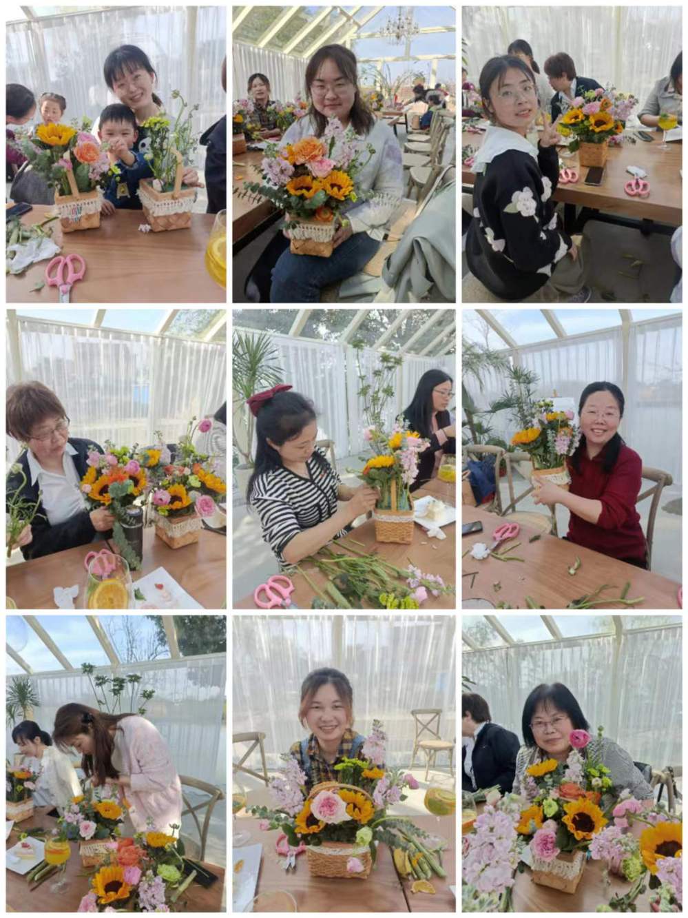 活动邀请拥有多年插花经验的花艺老师,带领着女教职工制作精美的花篮。花艺老师首先向大家介绍了鲜花的品种和寓意,并指导大家利用花卉,配以枝叶点缀,精工裁剪,根据不同的色彩、形状整合到一起,接着,大家边摆弄着花材进行构思创意,充分发挥自己的聪明才智,修剪、整枝、弯曲成各种造型,经过一个多小时的创作,一盆盆错落有致、生机盎然、创意十足的插花作品展现在大家眼前,令人赏心悦目。大家对自己的作品爱不释手,纷纷拿出手机合影留念。