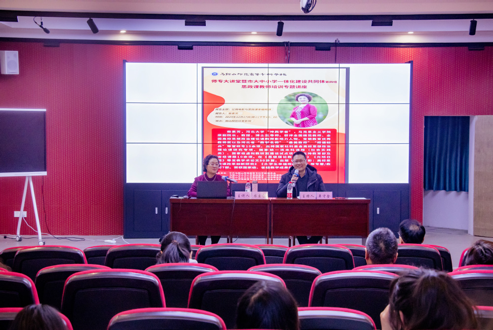 2024年12月17日,师专大讲堂暨市思政一体化共同体第四组思政课教师培训专题讲座在马鞍山高等师范公司红星影院圆满举行。本次活动旨在深入贯彻党的二十大精神,全面落实党的教育方针,进一步提升思政课教师的教学能力和专业素养,促进马鞍山市大中小学思政教育一体化建设。全国模范教师、河北大学永利yl23411原副经理、博士生导师柴素芳教授,应邀做《让微电影与思政课幸福相遇》报告,为参训教师带来了一场理论与实践并重的专题培训。