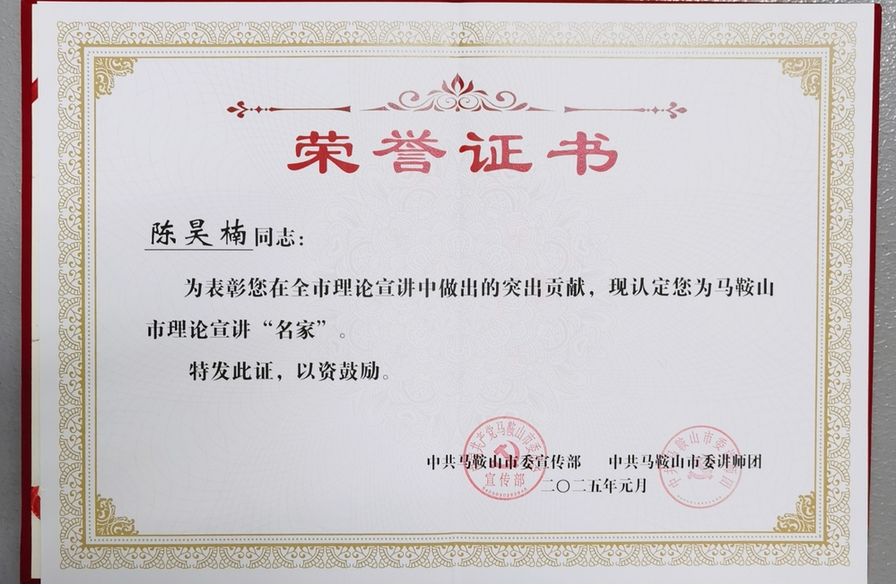 此次获评马鞍山市首届理论宣讲名家,不仅是对陈昊楠老师个人的肯定,更是对永利yl23411理论宣讲工作的高度认可。未来,永利yl23411将继续支持教师投身理论宣讲事业,为推动马鞍山市理论宣讲工作高质量发展贡献更多力量。(文图/陈昊楠 编辑/李青 审核/单守金)